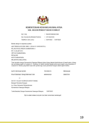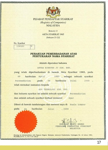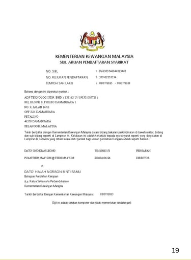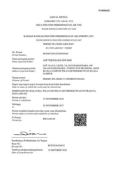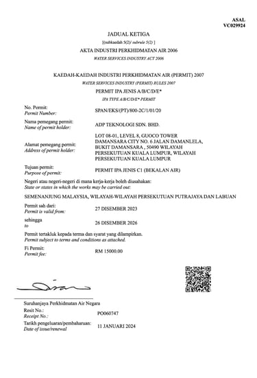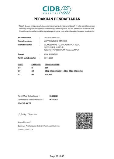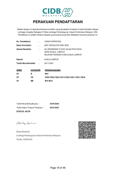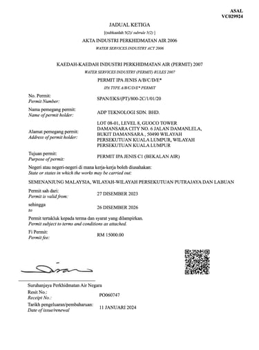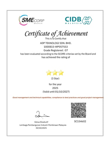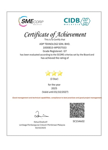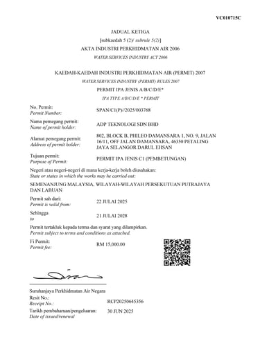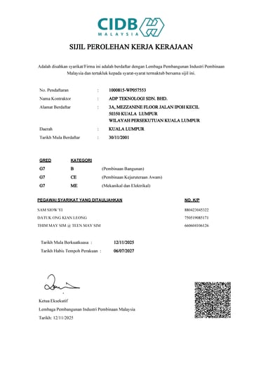 To ensure consistency, reliability, and international recognition across our operations, ADP Teknologi has obtained and maintains the relevant licenses, certifications, and accreditations governing both our technical services and corporate management systems.These certifications reflect our continuous commitment to regulatory compliance, structured processes and best-practice delivery across all projects.